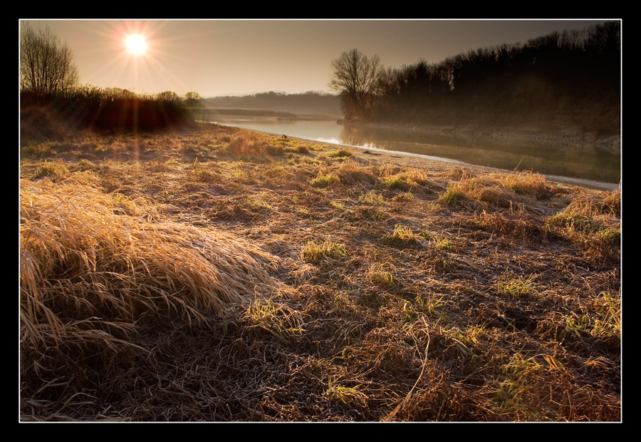 Mi piace la scelta prospettica. Scatto equilibrato, immagine leggermente slavata, un po' eccessiva la lunghezza dei raggi del sole (rompe un po' la sensazione di lento risveglio che pervade la foto, quel sole irrompe con un'ineleganza non sua e un po' dispiace). Avrei preferito un po' più di brillantezza dei colori, specie per l'erba che trovo altrimenti molto fotogenica, in questa foggia; lavorerei sulla resa del cielo, potresti caricarlo maggiormente di significato, così è solo uno spettatore distratto del mattino incipiente. Questa cornice le fa perdere molto.