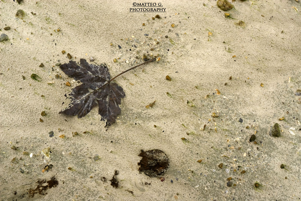 Uno scatto particolare e piacevole, un modo di osservare l'arrivo dell'inverno dal suolo, con questa foglia ormai spenta