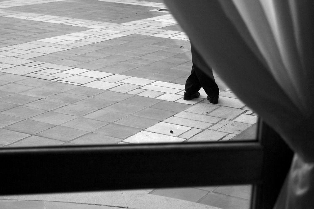 Bel gioco geometrico, che non stona con l'"innaturalità" della posizione dei piedi dell'uomo ma che da essi è valorizzato, risultando semplice e speciale. Una foto che altrimenti sarebbe stata bella e banale, è impreziosita da una scelta prospettica semplice e insieme piacevole, con la barra della finestra che sembra dare il la al ciclico incrocio delle mattonelle, e le gambe dell'uomo lì, a segnare una presenza invisibile eppur sentita.