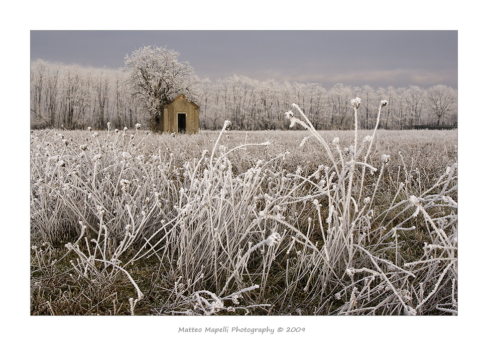 Bel paesaggio; delicata questa composizione con i colori come assorbiti dal ghiaccio