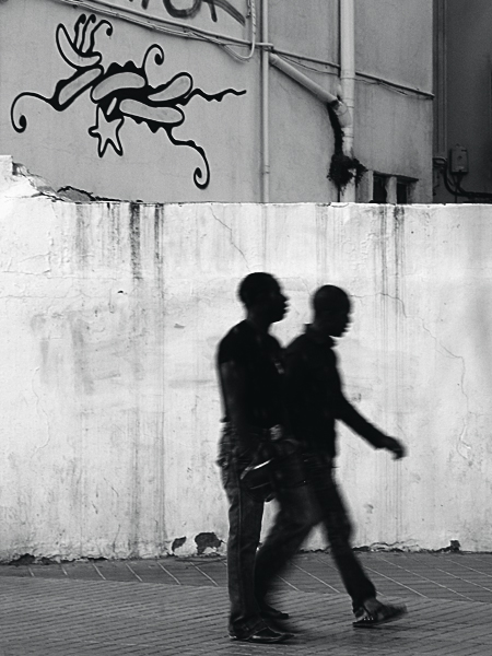 Mi viene da associare le due figure sovrapposte in basso con l'insetto del graffito in alto: quel braccio allungato riprende un pò il pungiglione, ma prendila come una forzatura interpretativa da parte mia.