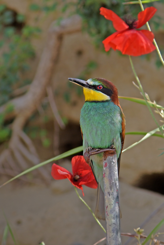 Bravissimo. è la prima volta che vedo un gruccione così 'da vicino', e poi così, coi papaveri intorno. Che bei colori, che bella inquadratura. E lui se ne è rimasto così, tranquillo! Ma come hai fatto? Complimenti