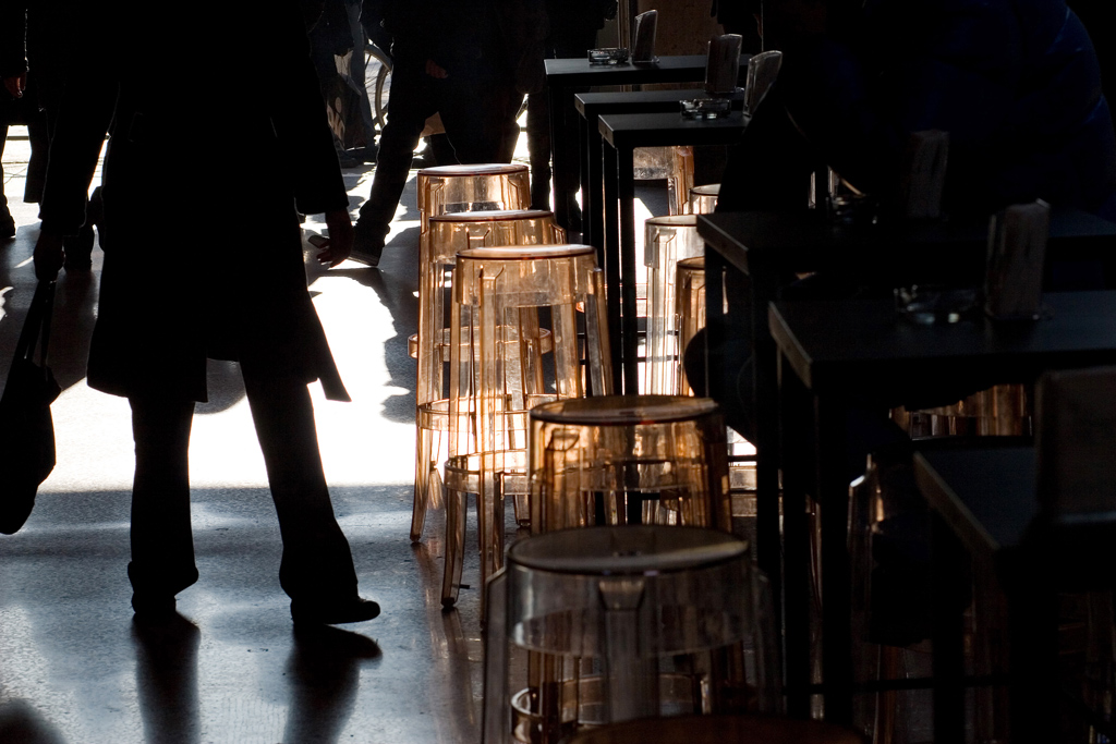 | Soggetto ed idea interessanti, penalizzati un po' dal taglio a sinistra e della profondità di campo, che mantiene in fuoco uno sfondo che avrei preferito meno definito. Avrei preferito un'inquadratura presa da più in basso. Fastidiosa l'ombra nell'angolo in basso a destra, un po' limitante per la spazialità della foto il taglio allo sgabello in primo piano. In genere ci trovo, complici le ombre poco decifrabili sulla destra, un'espressività un po' limitata dalla scelta di inquadratura ed esposizione: la scena, forse, era meglio valorizzabile da un punto di vista della contestualizzazione degli sgabelli illuminati e della resa generale delle distanze. E' qualcosa su cui lavorerei. |