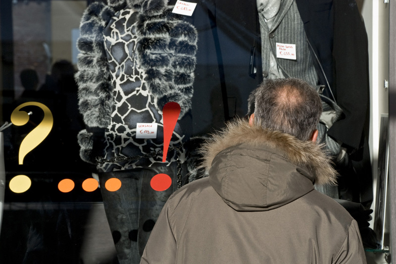 Il soggetto assume una forma simbolica dei nostri tempi e ne rovescia la logica...una presenza casuale davanti a una vetrina, sottomesso al tram tram della vita moderna, alle sue necessità, ai suoi riti...i saldi, vendere, acquistare, mode e vestiti imposti da grandi designer e lui, fuori da questo regime ha un sacco di perplessità, molti dubbi, tante domande