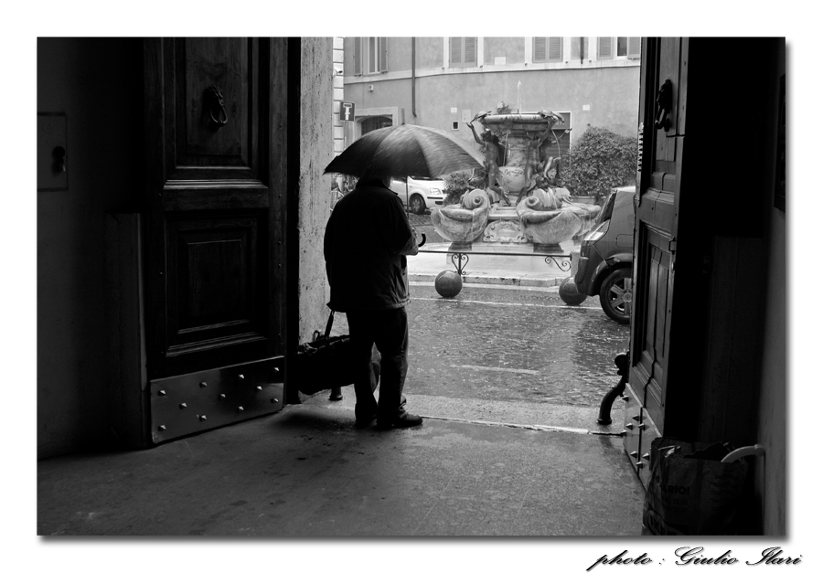 aveva iniziato a piovere forte, ecco perche il signore (forse per la fretta) aveva cercato riparo, ma era indeciso sul ripartire , l'ho trovato interessante con la borsa e l'omrello sospeso nell'indecisione.