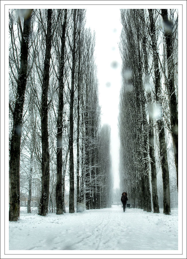 ti dirò il titolo evoca un qualcosa di frenetico che qui non vedo, anzi il contrario. La tua figura in mezzo al viale mi dona tranquillità, pace. La neve poi esalta questa sensazione, la natura non è mai frenetica se non nei suoi eventi estremi.