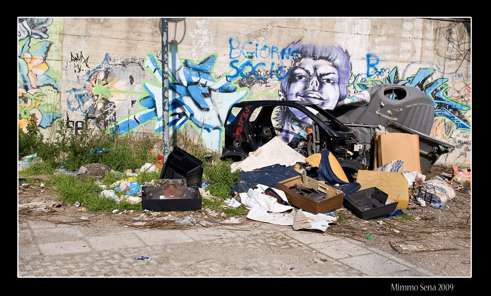 Il murales sullo sfondo quasi nasconde il degrado evidente. In ogni caso una Smart nella monnezza non l'avevo mai vista in vita mia.... son cose che si vedono solo qui! Sarei curioso di capire dove l'hai scattata.