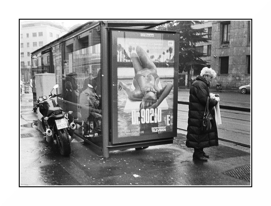 | Un'immagine che si nutre del rapporto-contrasto fra la figura nel manifesto alla fermata e la signora accanto completamento opposte proprio da un punto di vista fisico e di richiamo psicologico anche con riferimento alla sfera sessuale o sensuale. Il bianco e nero è buono e i grigi risentono un pochino della scansione. Ciao Tiziano |