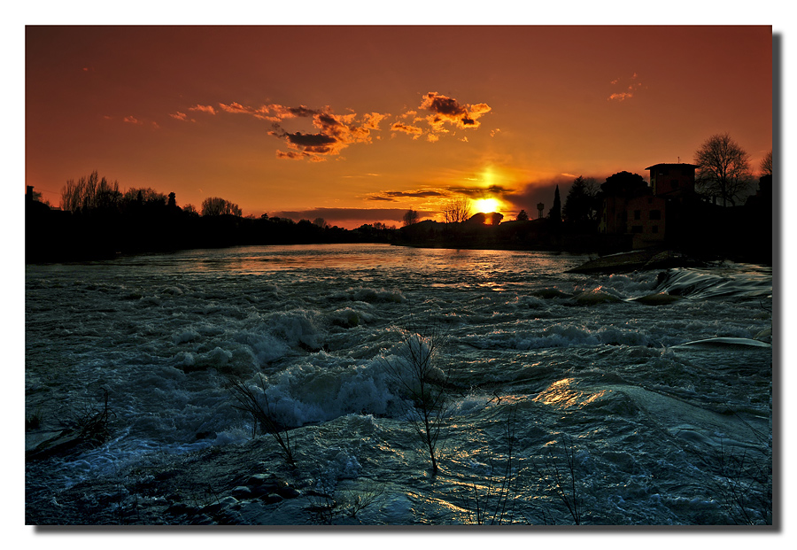 | Bene Paolo, hai intuito alla perfezione come riprendere questa scena. Magici i riflessi del sole calante che si rispecchiano sulla superficie impetuosa dell'acqua, alberi ed edifici in controluce lungo le rive del fiume donano profondità e tridimensionalità al paesaggio ed infine la bellissima atmosfera generale che nasce dalle calde tonalità cromatiche del cielo. Decisamente un ottimo scatto. |
