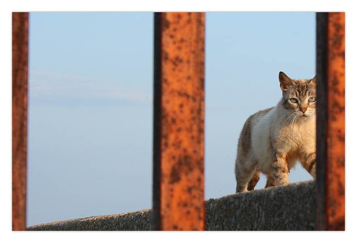 La parte del musetto leggermente nascosto dal montante della cancellata o ringhiera per me non disturba, anzi, da alla posa della gatta un atteggiamente più guardingo e subito calamita l'attenzione agli occhi.