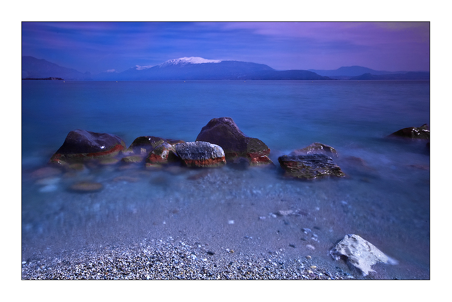 Scherzi a parte, davvero affascinante. L'azzurro dalle trasparenze limpide e insieme vaporose per il lungo tempo di esposizione, l'argento scintillante dei sassolini in primo piano, il blu dei monti lontani con il culmine innevato, tutto si integra perfettamente in una grande immagine.Forse non la migliore delle tue ma certo una delle più belle.