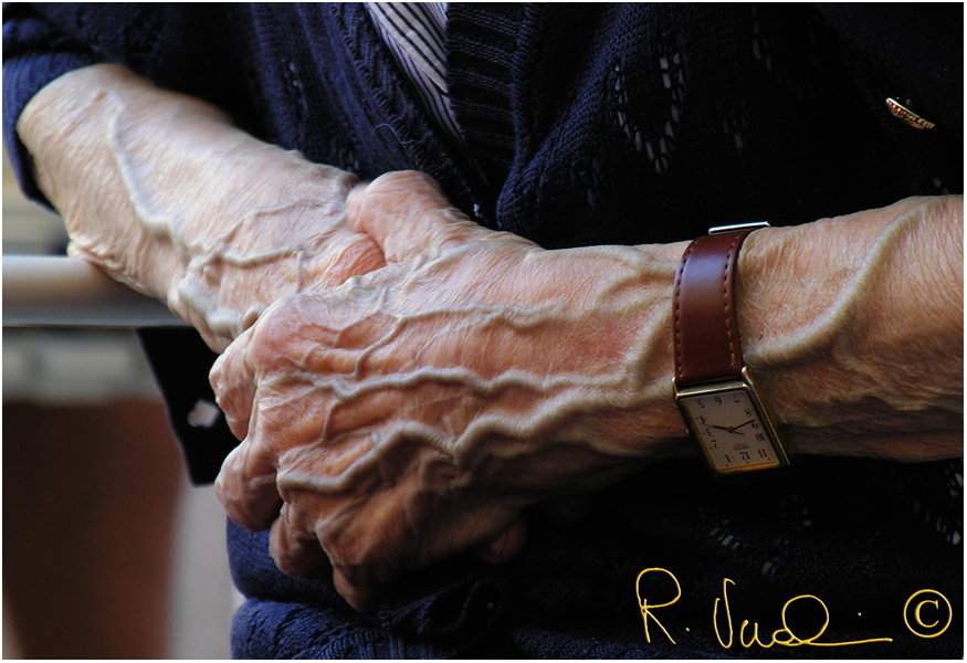 Queste mani di una tenera, canuta vecchietta, solcate come da rivoli di vita, fecero scattare in me l'istinto di 'ladro d'immagini'.