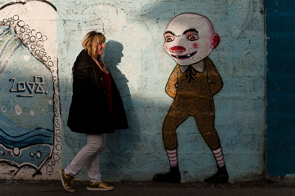 però io l'avrei vista meglio in bn oppure con qualche piccolo accorgimento in post per rendere più leggibile l'analogia cromatica scarpe/murale.