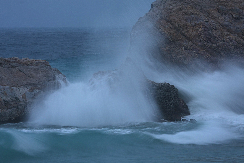 E' strano che per rappresentare una mareggiata, adotti per tutte le foto un formato orizzontale, un taglio verticale di suo, trasmette meglio il senso di movimento e dinamicità, oltre ad aiutarti a tenere sotto controllo la scena, il fondale che s'intravede ''oltre'' la mareggiata è un mare che non fa da spalla all'azione che riprendi, una tavola tranquilla che non tiene il ritmo dell'infrangersi delle onde sulle rocce.