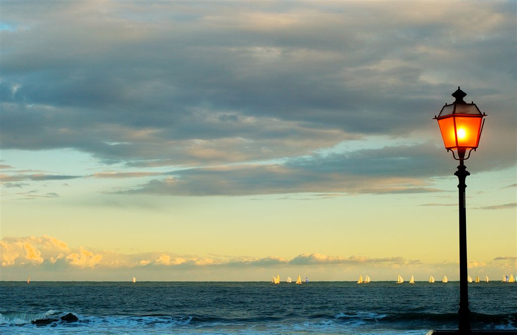 | Mi piace questo dialogo tra le luci del lampione e quella del sole che cala..