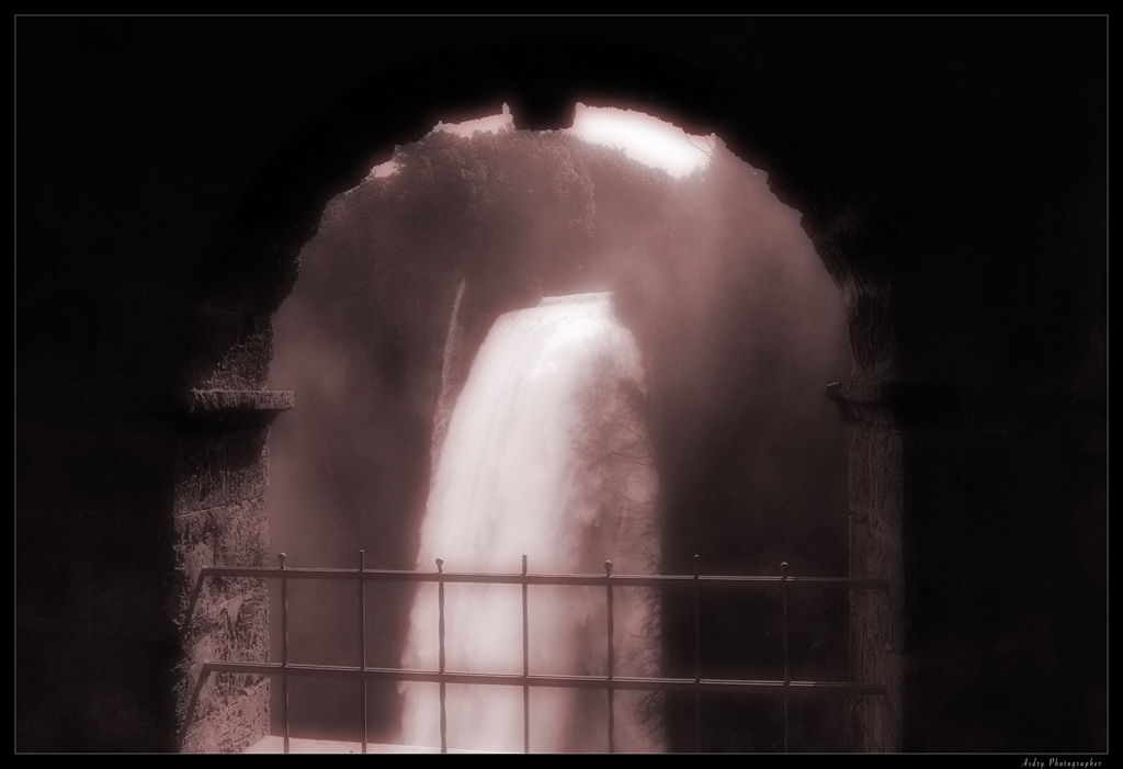 Bella la composizione con l'arco in pietra che fa da cornice al salto iniziale delle cascate.