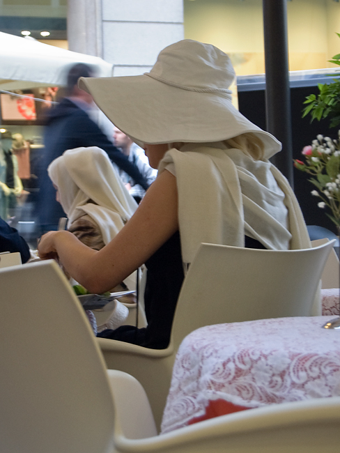 Un ottimo occhio luxi, come sempre: cerchi sempre gli accostamenti cromatici nei tuoi scatti e qui hai voluto anche accostare contemporaneamente delle forme: ecco che avevi trovato sciarpe cappelli e veli dello stesso colore e forma insieme agli altri componenti in primo piano (sedie) sempre di color bianco panna. Se mi permetti vi trovo anche un accostamento funzionale e molto fine tra culture diverse, orientali ed occidentali. Mi da fastidio l'ombra scura dell'uomo che passa sullo sfondo e avrei preferito maggiore pulizia e tranquillità.