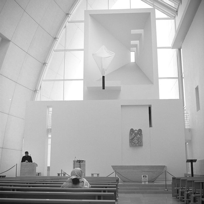la chiesa (Dio Padre misericordioso a Roma) è completamente bianca ma l'altare, il leggio e quell'altra struttura sovrapposta alla signora sono di travertino beige... dello stesso beige del cappotto della suddetta signora.
