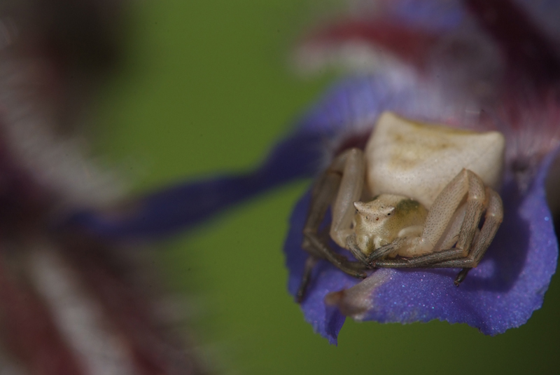 @ lilian: chiudendo di più avrei dovuto allungare i tempi e non potevo. Ho cestinato numerose immagini mosse oggi, nonostante il treppiede. Troppo vento. Il ragno è ritratto in 1:1 a 210 mm (basta raffrontarlo al petalo di borragine per farsi un'idea di quanto fosse piccino)