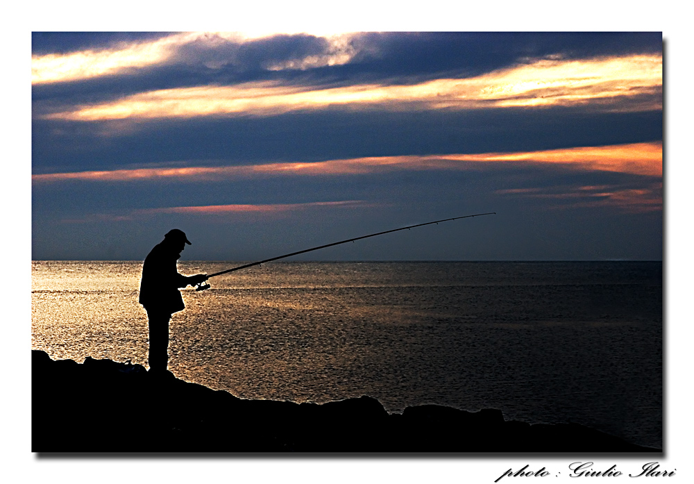 secondo me il taglio è perfetto, angolando di più il pescatore si andrebbe a perdere il riflesso sul mare, concordo x l'eccessivo contrasto, ...complimenti!