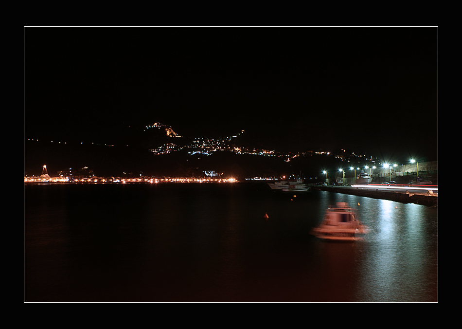 bello il movimento dell barca in porto incorniciato dalle luci sulla terra ferma. Un saluto Ok! Ok!