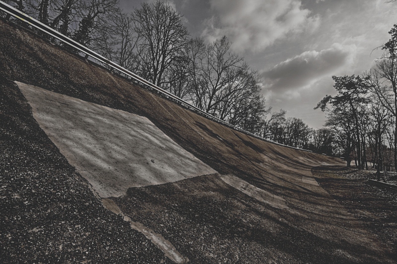 si Tiziano, i rattoppi, il sapere cosa è (è una delle due paraboliche dell'anella ad alta velocità dell'auotdromo di Monza, in disuso da decenni), gli alberi alla fine dell'inverno (febbraio) mi hanno dato questa sensazione, che ho cercato di mettere anche nel titolo...