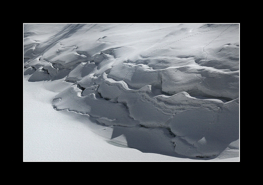 Attraenti le ferite di questo frastagliamento nevoso. Un paesaggio astratto su cui si stampa,ordinato, il percorso dell'animale.