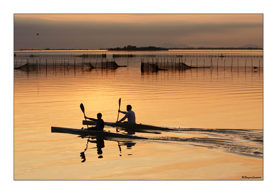 davero belle le tonalità di questa foto,cosi come la composizione in cui trovo davvero ben posizionati i due uomini sulle canoe.