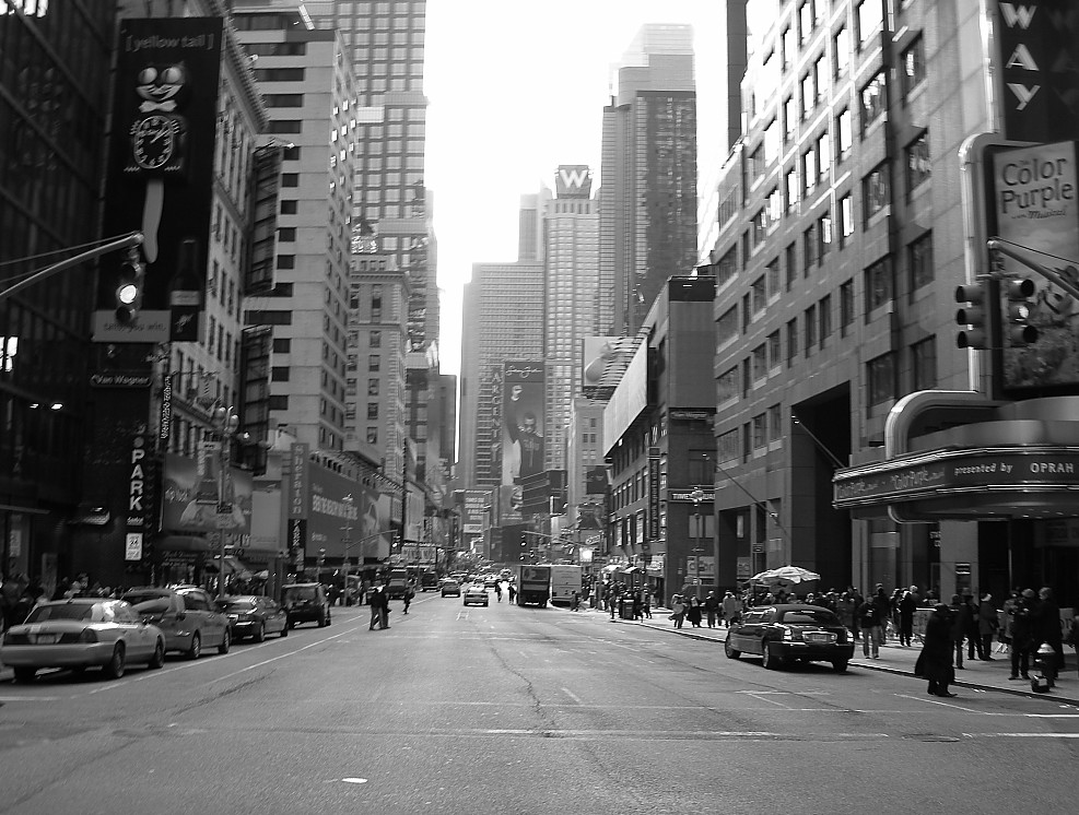 era domenica mattina , e potevo stare nel mezzo di broadway senza rischiare la vita , per un newyorkese è praticamente un evento e in fondo c'è timessquare non ingorgata come praticamente avviene ogni giorno! mi sono reso conto del micromosso solo dopo averla caricata!
