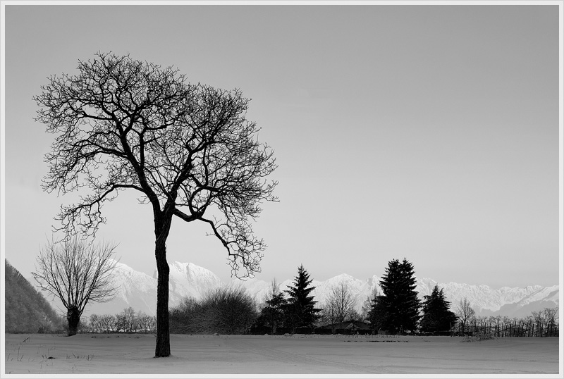 il maestoso noce sul palcoscenico e come quinte una corona di belle montagne innevate. bella scena! bravo.