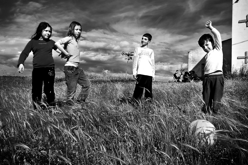 La staticità degli ultimi, contro l'idea di gioco rapido dei piccoli, suggerito da quel pallone che scorre fra le spighe mosse dal vento.