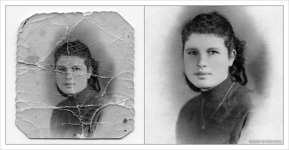 La foto di partenza è una fototessera di circa 50 anni fà, stampata su cartone e molto danneggiata dall'inappropriata conservazione da parte del proprietario. E' stato un lavoro di pazienza e "certosinità" (30 ore di lavoro circa), pixel by pixel, ma alla fine sono soddisfatto del risultato Ok!