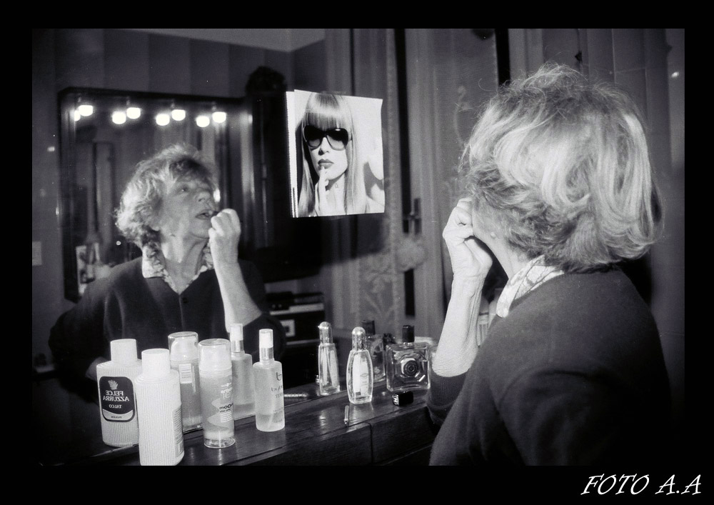 Se ho capito giusto il messaggio, per sottolineare il richiamo del gesto tra la modella nella foto e il soggetto io avrei nesso un paio di occhiali alla signora, come ad imitazione della foto.