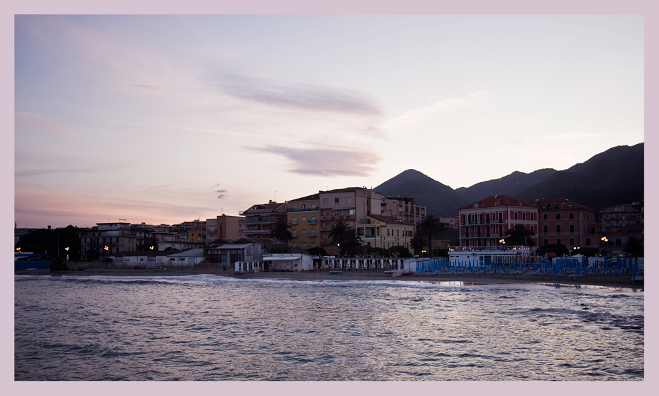 Un bel paesaggio serale, tutto declinato nella delicatezza delle tinte pastello, e con la penombra che invade rapida l'abitato e fa risaltare al massimo lo scintillio delle luci.