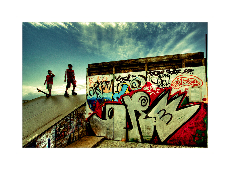 le tonalità acide rendono benissimo il contesto urbano della location...quelle nuvole in alto incorniciano la scena magistralmente...in attesa dell'azione imminente del ragazzo a sinistra....