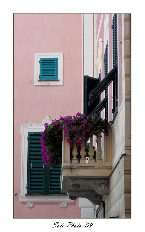 Un bell'abbinamento di toni fra i fiori e la facciata anche se per la vicinanza i soggetti si sovrappongono(fiori/ante).