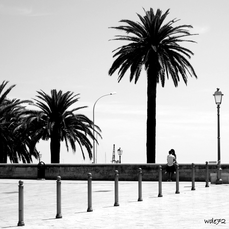 Walter questo scatto lo vedo un pò al limite fra la fotografia Life e la fotografia di Paesaggio. Viene fermata una rapresentazione ad ampio respiro di un luogo, in cui le persone anche se riprese in un attimo di intimità costituiscono solo degli elementi secondari. Buona la composizione del fotogramma con qualche incertezza sulla vicinanza della coppia con i paletti e alcuni elemeni sullo sfondo non proprio funzionali.