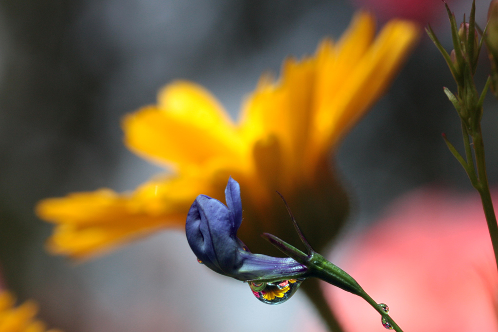E' splendido il riflesso nella goccia che ci restituisce nitido il gigante giallo alle spalle del delicato bocciolo.