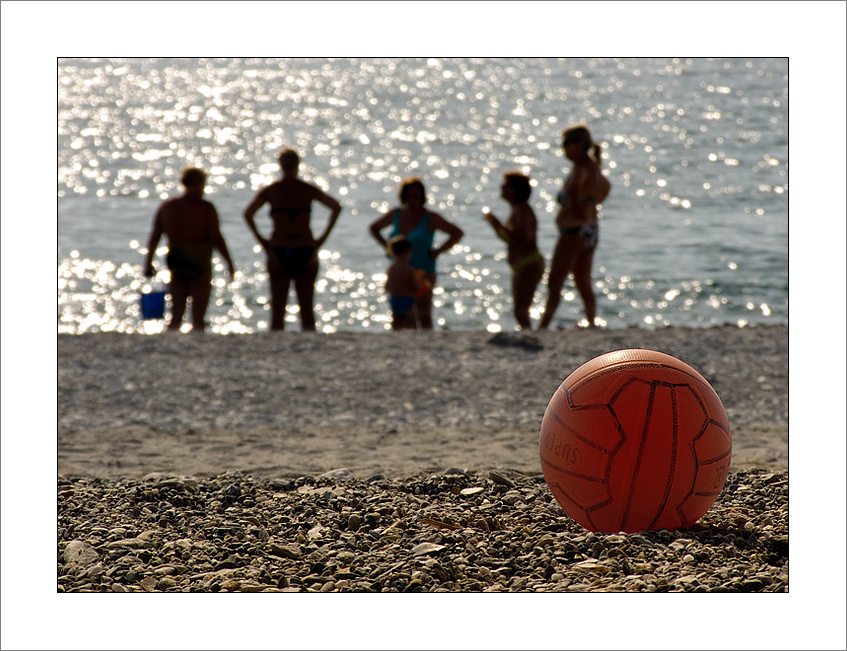 Una fotografia estiva ben realizzata, dal sapore squisitamente "life": manca infatti il "momento decisivo" per far rientrare lo scatto in un'ottica "street" ma l'ottima composizione non fa sentire la mancanza di alcunchè. Il pallone in primo piano è ben posizionato e nitido e si contrappone allo sfondo piacevolmente sfuocato che contestualizza lo scatto. Gli individui sullo sfondo sono ben delineati e ciascuno in una posizione funzionale: la sovrapposizione del bambino con la mamma non disturba quel piacevole dialogo che si intuisce fra i turisti. Indovinata l'esposizione del fotogramma che accentua il contrasto formale fra primo piano e sfondo.