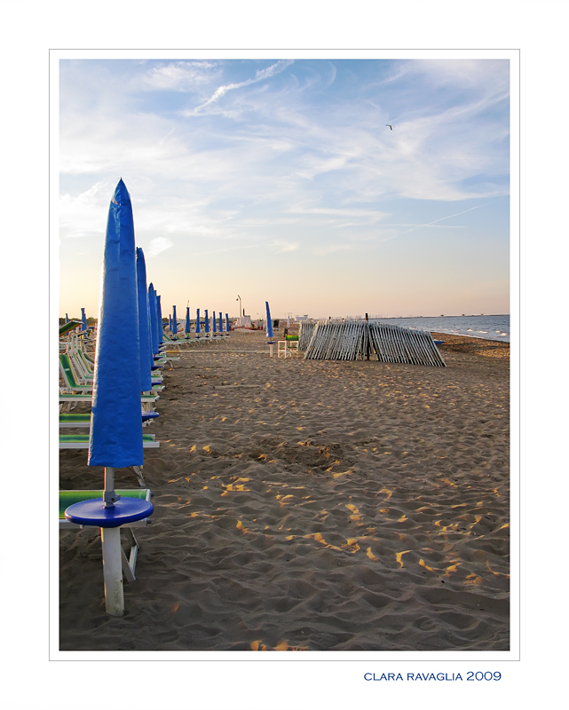 Carissima Clara, la luce e i colori sicuramenti sono le tue, l'inclinazione dell'orizzonte e sicuramete dato dalla distosione dell'otica, per la compo se ti potevi spostare leggermente sulla destra avresti sicuramente dato più armonia atraverso la curva degli ombrelloni, ma conoscendoti un pò, penso che rei oblicata da qualcosa, ciao e buona domenica.  |
