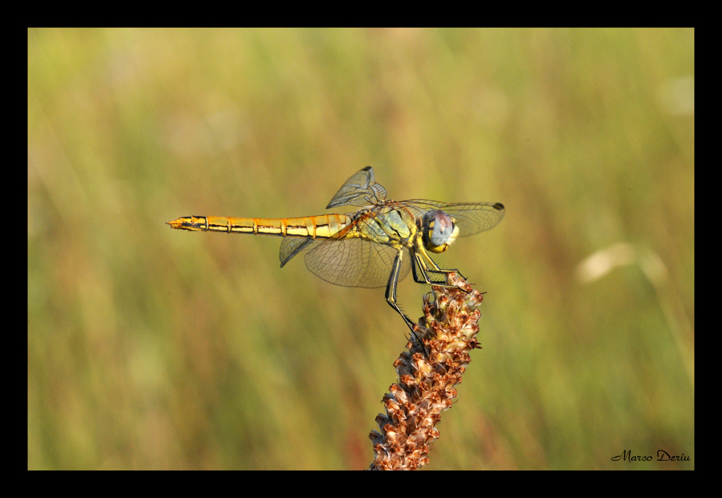 Secondo me manca un pelo in nitidezza questa femmina di Sympetrum fonscolombii... la composizione inoltre è un pò centrale, avrei cercato di avvicinarmi d più al soggetto... in compenso lo sfondo lo trovo molto bello...