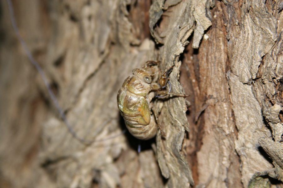 questo è l'inizio, quando la cicala dopo quattro lunghi anni passati sottoterra a mangiare radici, esce ,si arrampica sull'albero e da inizio alla trasformazione Ok! il tutto durante le ore notturne Wink