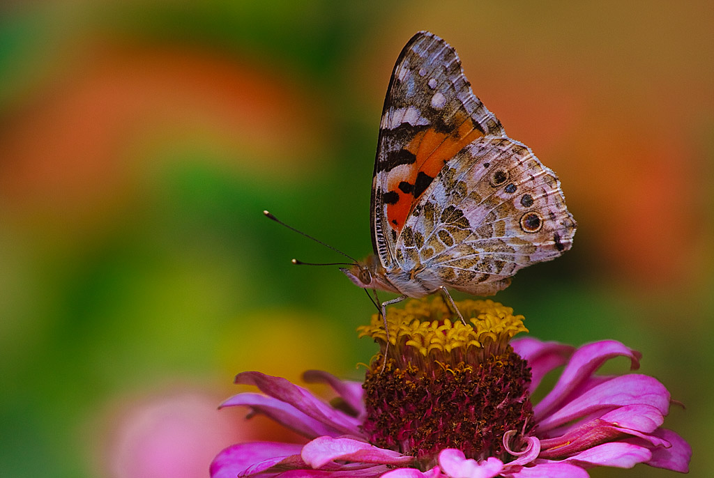 Da parte mia posso lodarti i colori stupendi e il bello sfondo che tuttavia impegna lo sguardo e non permette alla farfalla in primo piano di bucare lo schermo nonostante la buona nitidezza e la coretta maf.