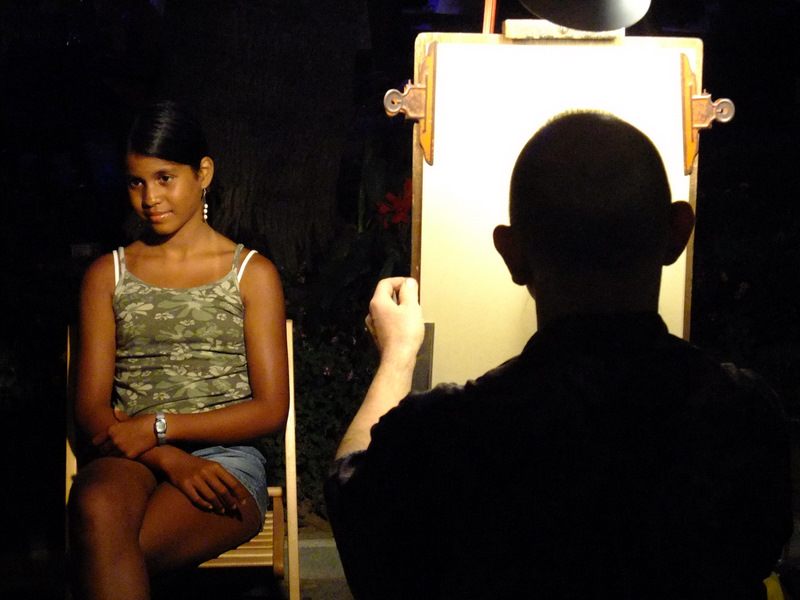Scatto difficile ben gestito, ottima la silhouette del ritrattista, efficacie la divisione del fotogramma in due parti uguali ma su piani differenti, piacevole Ok!