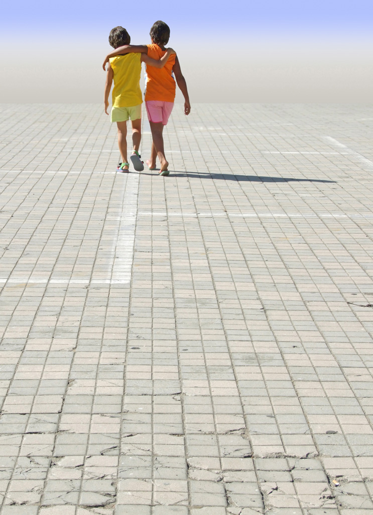 Ho effettuato del fotoritocco per eliminare le macchine ecc ... che c'erano nella foto originaria, cercando cosi` di focalizzare meglio l'attenzione sui soggetti principali e di rendere piu` esplicita la metafora della lunga strada da percorrere in una amicizia. Spero di essere riuscito cosi` a migliorarla!
