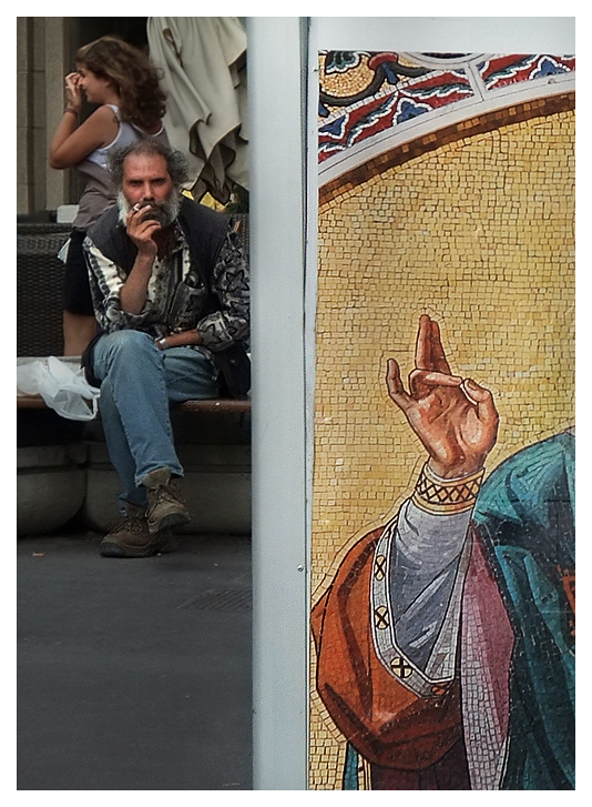 Complimenti per averla vista, mi chiedo però come sarebbe stata allargando il primo piano, salvo elementi di disturbo: mi manca un po' il personaggio del mosaico, un confronto tra volti e non solo tra gesti (questo sarebbe rimasto), e il panneggio della tenda avrebbe trovato eco nella veste turchese. Ci vorrebbe, tra i tasti delle fotocamere, un "congela realtà" per darci modo di studiare "al vivo" le inquadrature...