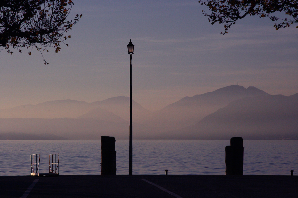 La foto non trova il suo equilibrio lo so ma mi sembravano belli i due riflessi, quello sulla passerella e la luce racchiusa nei vetri del lampione.
