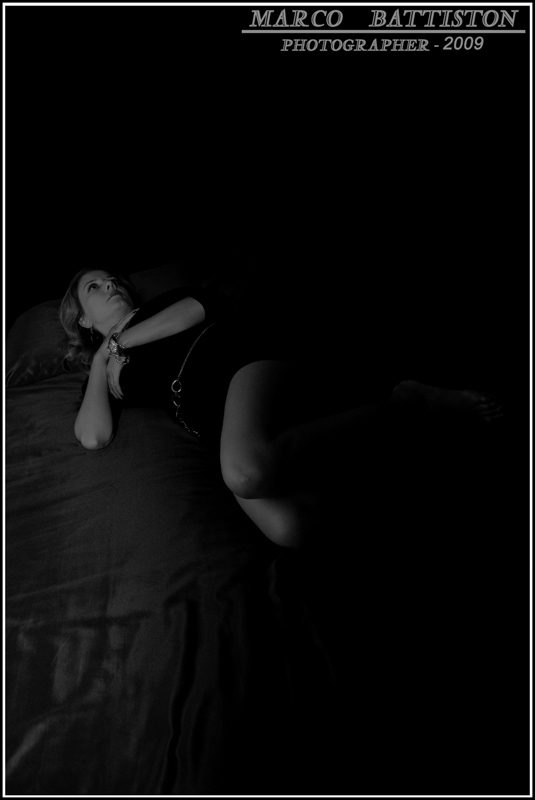 Io totalmente scura nella parte superiore, si intravedono pochissimo i piedi della ragazza, il vestito nero all'altezza della vita va a mescolarsi con lo sfondo mentre all'altezza della spalle si distingue ma in modo poco evidente.