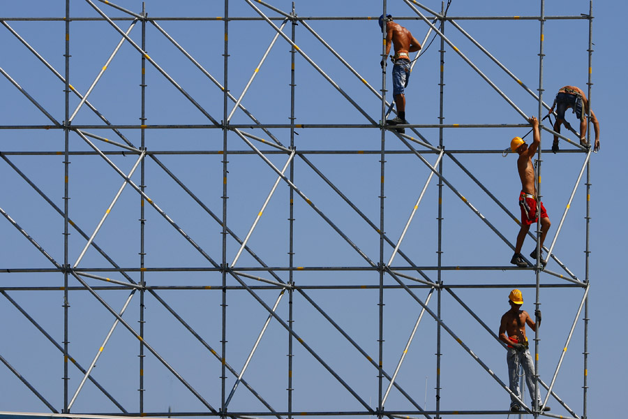 Resta la bellezza cromatica della combinazione delle tinte in gioco, le pose plastiche dei lavoratori che paiono danzare sulle impalcatura illuminata con cadenza regolare dalla luce solare più gialla, i corpi nitidi e leggermente affusolati dalla prospettiva di scatto, felicemente raggruppati nella destra del fotogramma, senza per nulla comprormettere l'equilibrio dell'insieme.