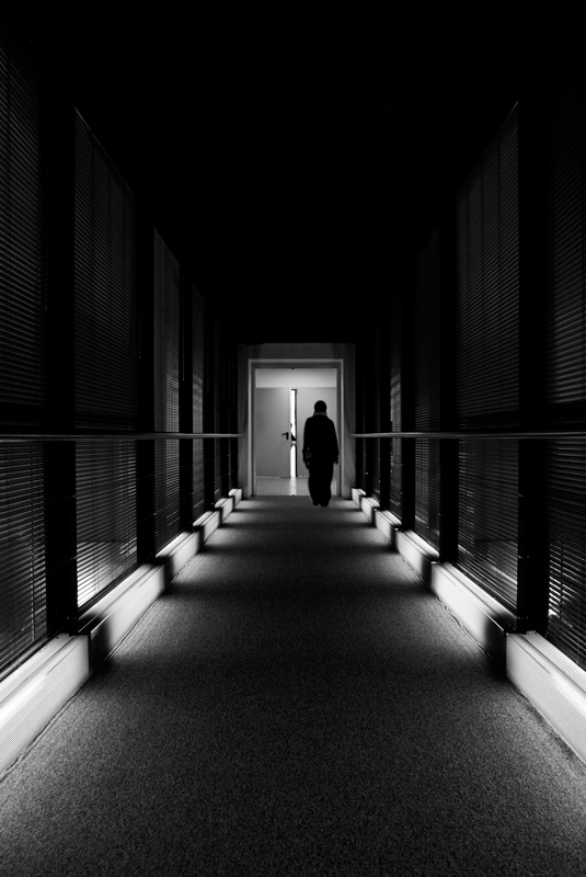 Il bianco e nero con una buona gestione delle luci e dell'esposizione generale unito alla composizione creano una certa tensione tangibile all'interno del fotogramma per questo incontro che sembra stare per avvenire fra questa giovane persona che sta per entrare e il locale che sta per accoglierla come annunciato dalla porta appena aperta e dalla sagoma qiasi impercettibile della persona che apre la porta e presenzia il locale. Misterico resta il motivo di questo "ingresso", forse un esame, forse un colloquio di lavoro o che altro. ma la suspence si crea e vederla nell'immagine è un riscontro visivo interessante. Ciao Tiziano Ok!